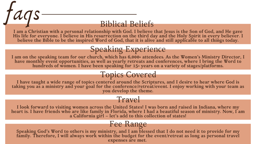 I would love to be a part of your next women’s event and am always open to traveling to meet amazing women across the United States! For the past decade, I have booked high-level speakers for our non-denominational church. I understand the importance of finding someone relatable to your church community. I look forward to discussing with you how we can bring a personal touch to your retreat, conference, or event so that your gals will truly connect with God in an intimate way that will carry over into your ministry.